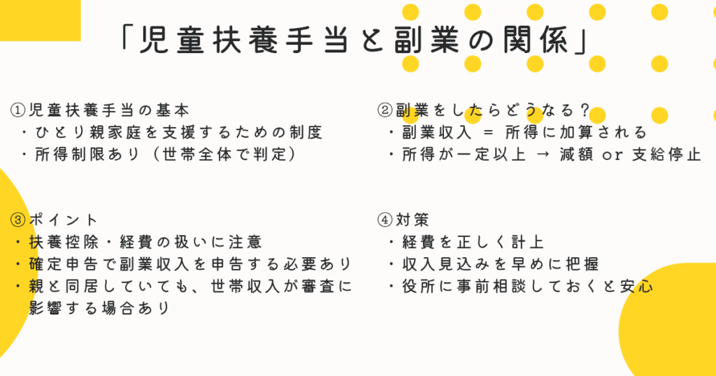 副業収入も「所得」に含まれるため、金額によっては児童扶養手当の支給額が減ったり、最悪の場合は支給停止になる可能性もあります。